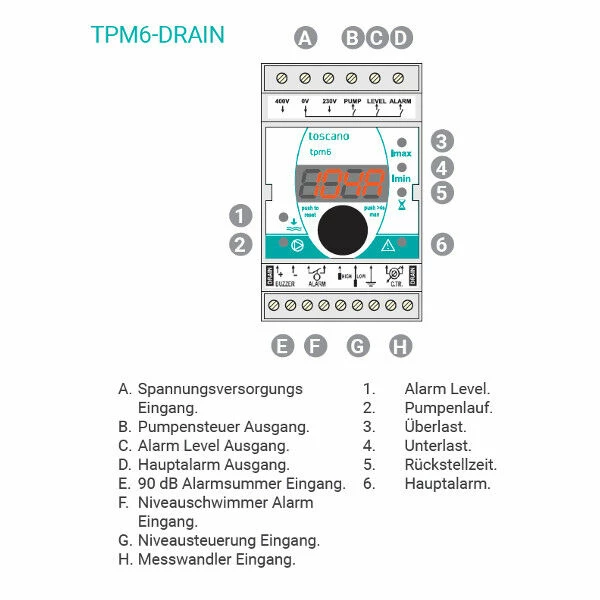 - Separate externe Ausgänge für Pumpenbetrieb, Alarmpegel (Überlauf) und Hauptalarm.